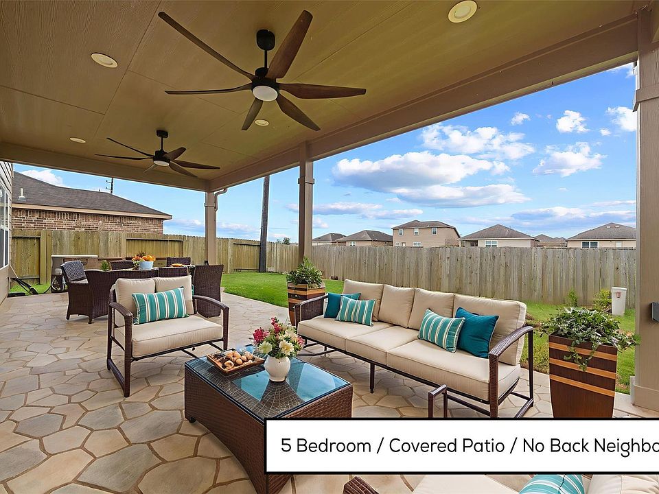 Move-in ready! Beautiful 2-story home in the gated, master-planned community of Sterling Lakes with no back neighbor for added privacy! Inside, you'll find neutral paint, wood-look tile on the 1st floor, an open living/dining area, and granite countertops in the kitchen with stainless steel appliances and a breakfast bar. Also downstairs, the primary bedroom suite includes a separate shower, tub, and walk-in closet while upstairs holds a large game room, 4 additional bedrooms, and the 2nd full bath. Enjoy outdoor entertaining under the spacious covered back patio with ceiling fans! Conveniently located around the corner from the neighborhood amenities (lake, pool, park, clubhouse), schools, and easy access to Hwy 288!