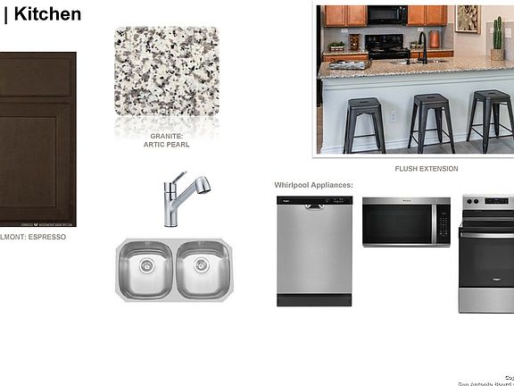 Perpetuo ceramic tile flooringUpgraded cabinetsWhirlpool stainless steel appliancesAutomatic sprinkler systemFully sodded yardExtended breakfast barCarrara-style entry door