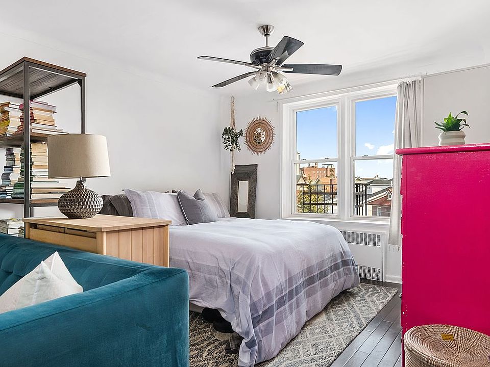 This sun-drenched studio offers charm, space, and style with picturesque views of classic Tudor townhouses and open sky. Thoughtfully designed, it comfortably fits a queen bed nook, full living room set, dining area, and more. The extra-large kitchen provides ample room for cooking, while the stylish bathroom-complete with a window-adds a touch of charm. Storage is a standout, with two closets, overhead compartment, and abundant cabinetry.
