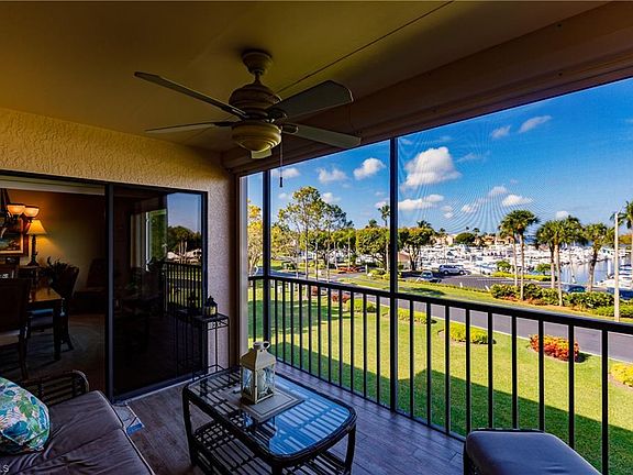 AWESOME unobstructed MARINA VIEW! Beautiful 2 bedroom plus den on 3rd floor overlooking The Landings marina and the Caloosahatchee River. Take elevator to this updated unit that has newer cabinets, double oven range, granite counters in kitchen and baths, tiled entry, den & wet areas, and new carpet in living & dining areas. IMPACT windows throughout plus electric storm screen on lanai which doubles as a sun shade. Quite roomy with over 1400 SQFT under air. Covered carport, storage closet and sunsets included! Offered TURNKEY. Short walk to the (no minimum!) Wheelhouse waterfront restaurant. Plus - you could see your boat from here! It's a million dollar view for a fraction of the price. Golf, tennis, pickleball, bocce, and marina slip (subject to wait list) included! So much to see and do inside and outside of this amazing gated community - it's the best kept secret in SW Florida! Come live the dream at The Landings Yacht Golf & Tennis Club.