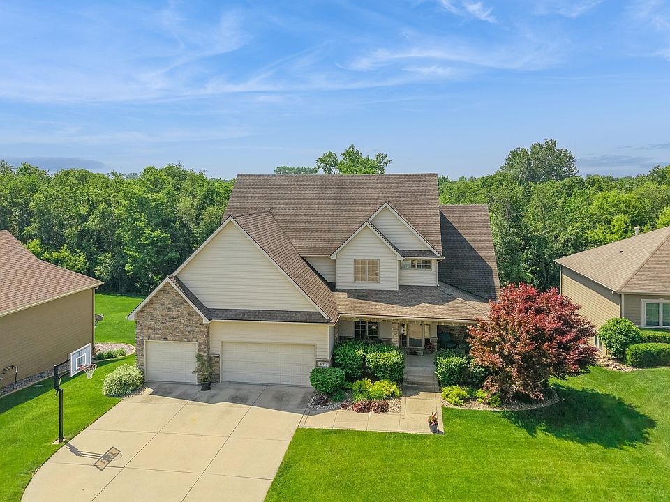 Meticulously maintained and incredibly peaceful, this Ashton Pointe home backs to mature trees and offers a rare sense of privacy in a prime location. Framed by beautiful landscaping, the covered front porch and maintenance-free back deck provide perfect spaces to enjoy the outdoors. The main floor’s thoughtful layout features a spacious primary suite with a soaking tub and tiled shower, a large living room with fireplace, and formal dining—all with views of the trees and landscaping. The kitchen includes solid maple cabinets, granite countertops, new appliances (2021), and space for casual dining. You’ll also find a large drop zone and a laundry room with a wash-sink as you step in from the 3-car garage. Upstairs includes three bedrooms, an additional playroom/nursery, two full baths, and a versatile flex space for work or play. The walkout basement adds a fifth bedroom, full bath, and large family room. Triple-zoned HVAC replaced in 2022. Surrounded by nature and minutes from Johnston schools.