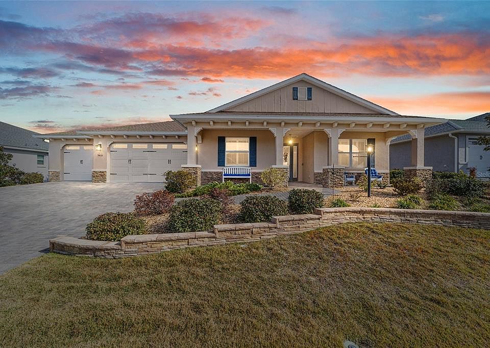 Beautiful Arlington located in the Stonebridge neighborhood of Candler Hills. This home has 3 bedrooms, 3 bathrooms, a 3 car garage and an air conditioned office in the garage. Both bedroom 2 and 3 have carpet, ceiling fan, and plantation shutters. The 2nd bedroom has an attached, private bathroom with a quartz single vanity, tile walk-in shower, and linen closet. The 3rd bath has single vanity sink, tub/shower and tile. The open gourmet kitchen with wall oven/microwave, and stove top with hood, has a large island with added cabinets, tile backsplash, stainless steel appliances, pantry with pull out shelves, and white cabinets. The living room has plantation shutters, and ceiling fan with French doors leading to the enclosed Florida room. The oversized master bedroom has a sitting area, tray ceiling, and carpet. The master bath has a huge tiled walk-in shower, double vanity sink with quartz, linen closet, and walk-in closet with added shelving. The laundry room has added cabinets with sink and counter. The spacious Florida room is under air with tile floors, French doors from the dining and living room areas, pull down shades, and 2 ceiling fans. Outside is a paver patio with an automated retractable awning, and white vinyl fencing. The 3 car garage has cabinets and sink, generator ready wiring, wire shelving, and a water softener. Office in the garage is air conditioned with tile floors, fan, and built-in cabinets. Additionally, the exterior of the home was painted in November 2022. Do not miss the opportunity to own this beautiful home.