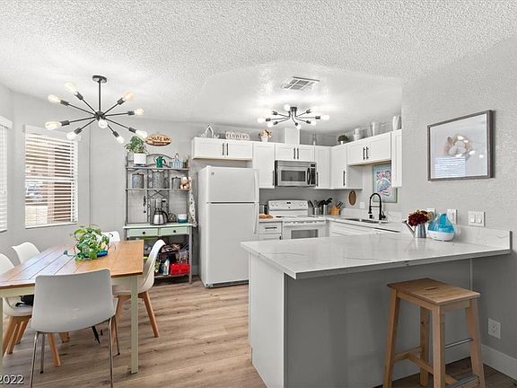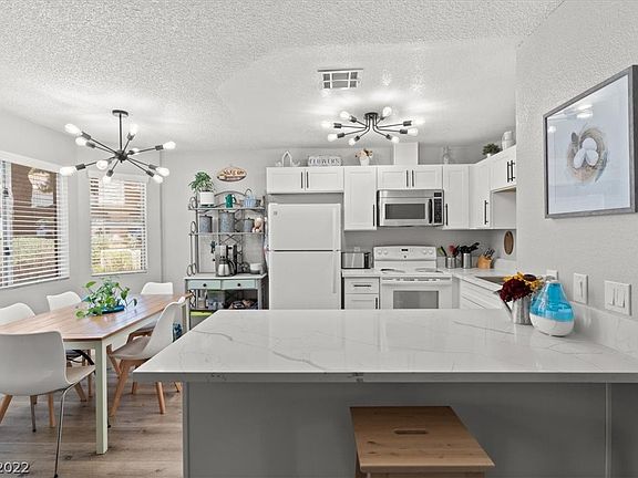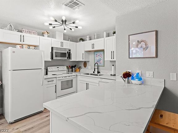 Stunning Downstairs unit! Gorgeous Remodel with a designer fireplace creating the perfect ambiance. Quartz counters, white shaker cabinets, modern light fixtures, fully upgraded bathrooms, immaculate laminate flooring throughout. Plenty of storage, 2 full baths, Quaint covered patio and close to pool to get away from the lovely Vegas heat.