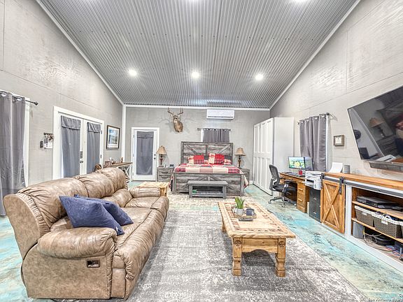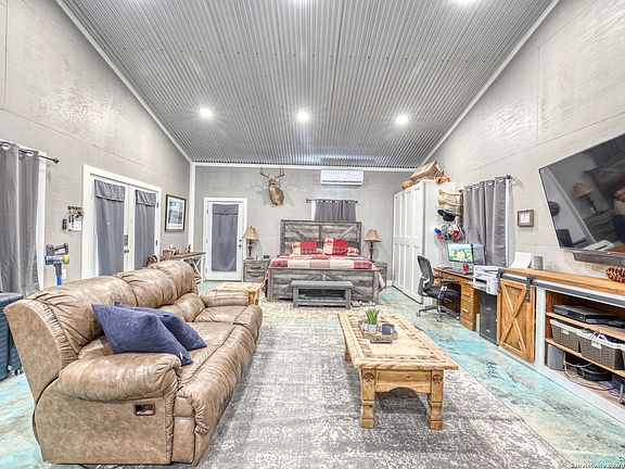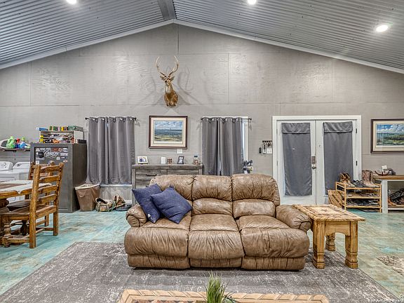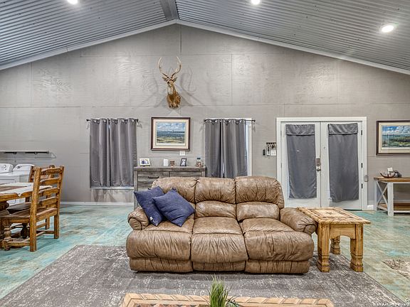 Just minutes from the highly-desired Knippa ISD, this 55-acre property offers the perfect balance of peaceful country living and modern comfort. It's ideal for a weekend getaway, horse or grazing land, or a prime investment opportunity. A beautifully designed 800-sq ft studio-style barndominium boasts an open-concept layout and thoughtfully chosen high-end finishes throughout. The kitchen and bathroom areas feature granite countertops, custom cabinetry, and quality fixtures that give the space a luxurious feel. Step outside and enjoy the massive 1,000 sq ft covered porch for relaxing and entertaining, and two outbuildings for storage, workshop use, or agricultural needs. The land is perimeter fenced and serviced by an electric pole and meter loop, city water, a private water well (pumps 1 gal per minute--not currently hooked up), and septic system. A beautiful variety of mature native trees and shrubs, including mountain laurel, persimmon, huisache, and cenizo, add to the natural charm and attract local wildlife. White tail deer, axis, javelina, quail, dove, turkey, fox, bobcat, and other native varmints roam the property. The ranch is ag exempt, which means the yearly tax burden is far lighter! Enjoy panoramic views of the rolling hills that surround the area, with peaceful, starry nights and wide-open skies. Just a short drive to Uvalde or Hondo (and about an hour from San Antonio), you'll have convenient access to dining, shopping, and daily essentials-while still enjoying the quiet of a true country lifestyle. With its flexible use potential, this property is a rare and valuable find in the heart of South Texas!