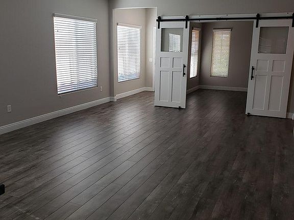 Modern brushed nickel hardwareBig lotSliding barn doorsPiedrafina sinksLarge covered back patioCozy front sitting areaBay window