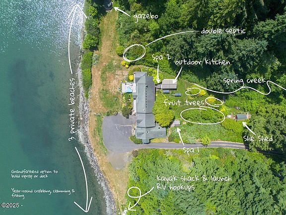 Once the heart of old Waldport—the cannery, ferry, and general store—this fully furnished 5-acre bayfront property still holds the quiet shape of those days. Built in 1926 by the cannery owner's daughter, the home blends classic charm with modern updates. A big, warm family room invites you to settle in. The remodeled primary suite offers vaulted ceilings and sun-filled windows, with an attic full of charm above. Downstairs, a chef's kitchen and stone hearth welcome slow mornings and big meals. Two bedrooms and a full bath sit nearby. The former artist's workshop is now a loft-style guest space. There's room to roam, RV hookups, and tidefront access for clamming, crabbing, or kayaking.