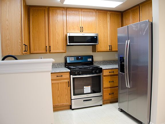 Carpeted throughout, kitchen with new appliances. Small Patio from one of the bedrooms looking out to greenery.
