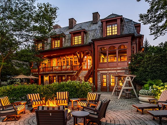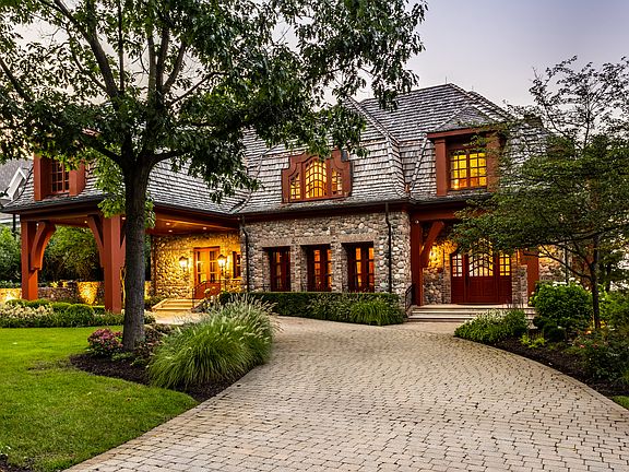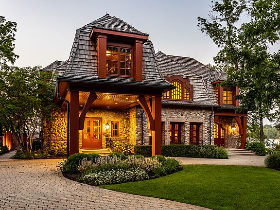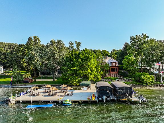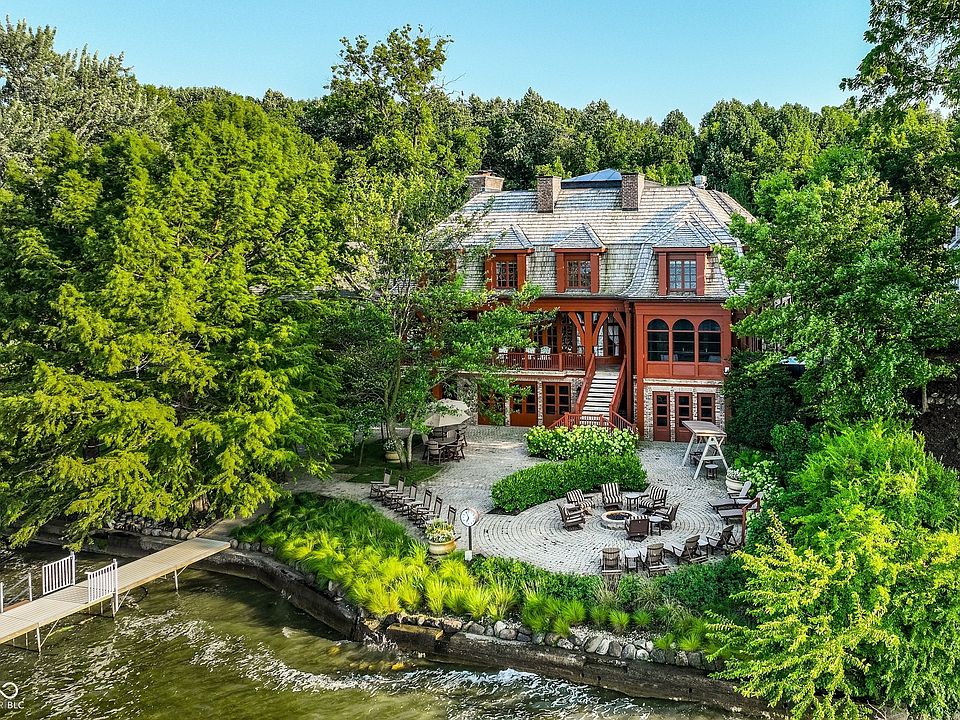 This exceptional Indiana estate at Lake Maxinkuckee offers timeless architectural elegance with lifestyle amenities across two connected parcels. Totaling over 35,000 finished square feet across multiple custom structures with 250 feet of lake frontage, and the largest private dock on the lake (4,000 square feet), this property boasts entertaining, wellness, and recreation spaces. The European-inspired main residence features nearly 14,000 square feet of elegant living space with timber-framed ceilings, hand-painted details, and abundant windows with expansive lake views. There are 8 bedrooms, 10 full plus 2 half bathrooms, and 4 fireplaces across 4 levels (with partial elevator access), including the rare walkout lower level. The home balances grand entertaining spaces with intimate screened sleeping porches and private quarters, creating a true retreat for family and friends. The adjacent indoor pool house provides year-round swimming and has motorized retractable lake-facing doors for true indoor/outdoor living, plus a hot tub, heated paver pool deck, fireplace lounge area, live plant wall, steam room, and fitness areas. The charming 3-bedroom, 2.5-bath guest house offers comfortable, private accommodations. The 8-car garage is ideal for vehicle storage, toys and recreational equipment. Extensive outdoor living spaces include a firepit, sand volleyball court, dining terrace and expansive patios perfect for relaxing or hosting visitors lakeside. A thoughtfully designed entertainment complex with Creston smart automation includes a professional-grade 4-lane bowling alley, arcade, shooting range, and club-style bar, offering versatile options for leisure and gatherings. A discreet underground tunnel connects the two parcels, housing mechanicals away from the main residence to preserve the peaceful lakefront environment. This rare compound represents the ultimate in Midwest lake living, blending luxury, scale, and lifestyle in an iconic setting.