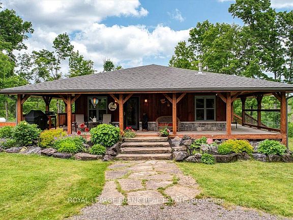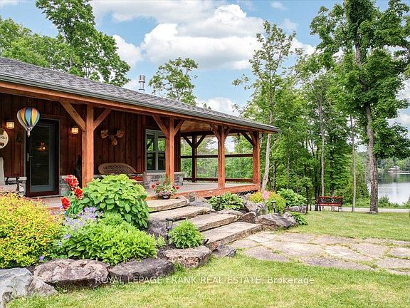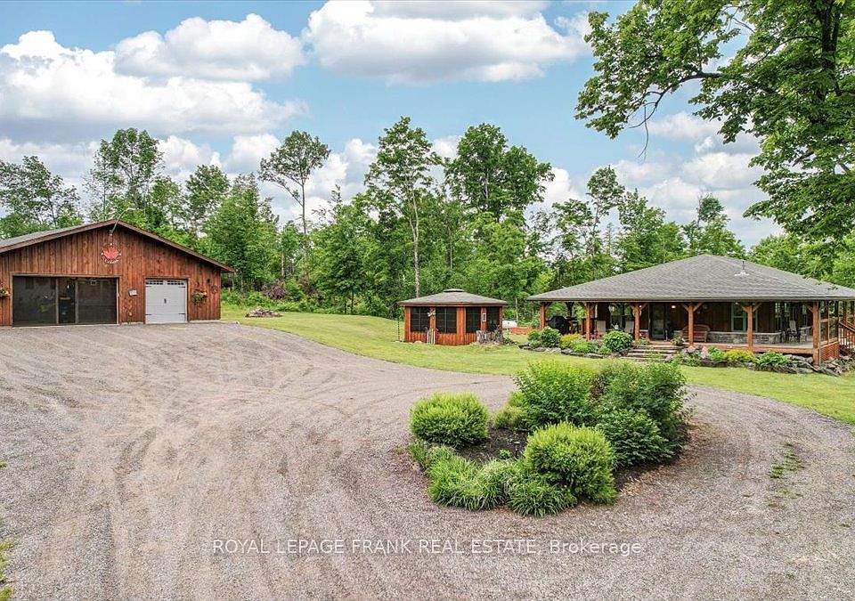 Steenburg Lake! The complete package and more! This Timber Frame home is sure to impress. Amost 1800 square feet of living, with a full wrap around porch, perched perfectly over looking beautiful Steenburg Lake, with clean waterfront, all sitting on 86 acres of land with trails throughout. The waterfront is across the paved cottage road with a large dock system and newer floating boat house, big enough for a 22ft pontoon boat. There is a 30x40 heated shop, with drop down screen door system and a large covered area for extra storage. Hangout in the screened gazebo or chill on the wrap around porch. Extra features include: auto generator, central air, high efficiency furnace, underground sprinklers, alarm system with cameras, stainless appliances, hardwood flooring, a small pond with fountain and so much more. Recent upgrades include furnace, central air, roof and eavestroughs. This is a legacy type property that will be hard to match. Come take a look and you won't want to leave!!