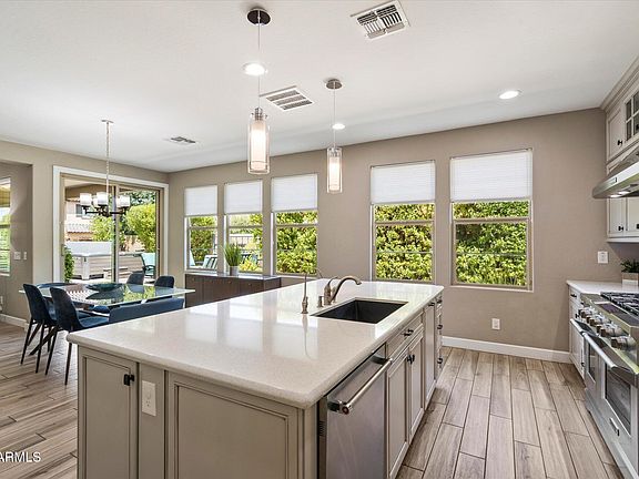 This highly upgraded stunning home in the South Chandler gated community of Echelon at Ocotillo is now available. Seated on a sizable lot with imported exterior travertine pavers, outdoor gas firepit, high end customizable spa, privacy shrubs, and a low maintenance backyard perfect for a lock and leave option. Home is in close proximity to community lap pool & spa, covered ramadas, walking paths, sport courts, lake system, and other community favorites for recreation and dining experiences. See upgrade list in documents tab and displayed at property. From sizable bedrooms & maximized square footage to luxurious finishes appreciated by those with an appreciation for details this home stands apart by blending both luxury and convenience all in one. With 4 Bedrooms, 3.5 Bathrooms, Loft, and Office space you can design this home to meet your needs. The Master bedroom is located downstairs and has been insulated to create added privacy and cooling from the common areas of the home. Throughout the home you will find upgraded cabinetry with soft close (and slide drawers in the kitchen), quartz countertops throughout, tiled flooring in all lower-level rooms. All garage bays have epoxy flooring, added wall and ceiling insulation, and insulated garage doors keeping the space an ideal temperature even in summer months. Upstairs Loft is sizable with vinyl flooring with versatility to match your scenario and prewired for a mounted TV. One bedroom upstairs has an en-suite bathroom. All faucets, hardware, and fixtures have been upgraded. Exterior space is designed to both maximize the space but with a limited amount of maintenance for those looking for a lock and leave property or just wanting to get away from maintaining a huge yard. Travertine covered patio is the perfect place to retreat after a long day or you can get cozy by the gas fireplace after relaxing in the multi-featured hot tub (with both heating element and chilling features!). Turn on the tunes (using the prewired speakers) and get outside to enjoy the refreshing greenery or while grilling for guests. The property also includes desirable features such as permanent holiday lighting and smart home features.