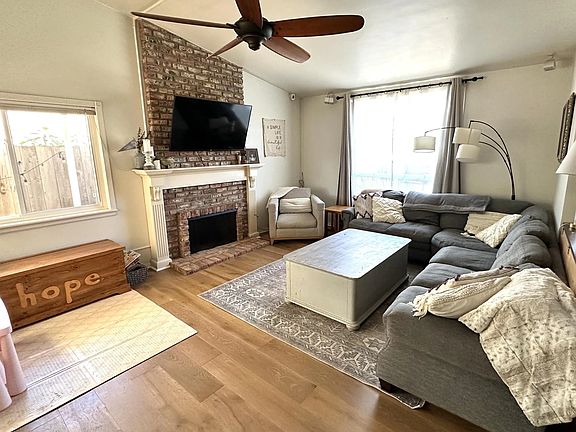 Amazing Rancher in Woodcreek Community of Fallbrook. No Mello Roos Taxes, Low HOA. Newer Hardwood floors, Upgraded Windows, bright and open floor plan with views to rear trees to private gated sanctuary Patio with Large Shade tree and high Privacy fencing. The fully upgraded kitchen features fresh white cabinets, large view window, included Stainless steel Appliances: Refrigerator, Dishwasher, Range, Microwave built-in. Room for eat in Kitchen or step out to Patio dining. The Vaulted ceiling Brick Fireplace in living room flows to serene views northwest patio and expand entertainment to formal dining room. Newer Air Condition Unit and Water Heater. Fully finished Garage with Spacious Attic and Laundry Niche. Orange Fruit Tree Front left.