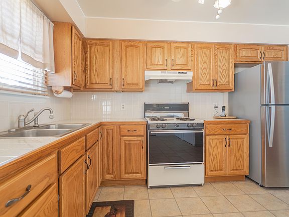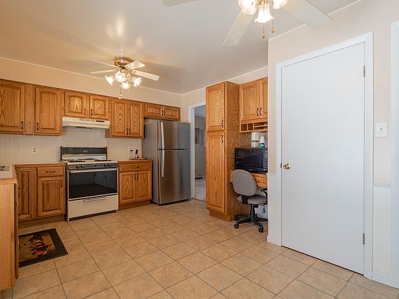 - Description: Pantry, Oak Cabinets, Tile Counters and Backsplash, Linoleum Tile Floor, Refrigerator, Stove, Range Hood, Microwave, Double SS Sink, Ceiling Fan