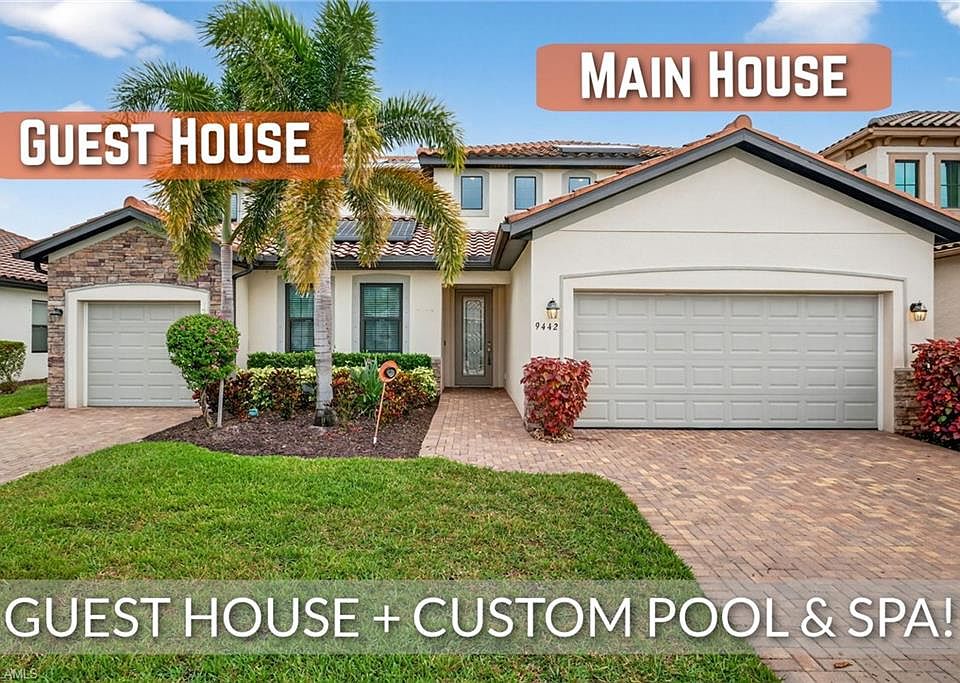 GLEAMING ABOUT GREENLEIGH!! WITH its rare, attached guest house, sparkling lake view, and custom pool and spa (with huge expanded covered lanai), 9442 Greenleigh Ct. will have you gleaming!! Highlights of the main home include popular open concept great room floor plan, crown moulding, large kitchen with stainless steel appliances and 4 person breakfast bar island, WHOLE HOUSE SOLAR POWER (already paid in full by seller with $0 remaining balance), IMPACT WINDOWS WITH ELECTRIC ROLL DOWN SHUTTERS FOR LANAI, tile floors throughout the ground level with carpet on 2nd level, HUGE BONUS ROOM/LIVING ROOM ON 2ND LEVEL, huge 2nd floor master suite with amazing walk-in-closet, large guest bedrooms, upgraded guest baths and more!! HIGHLIGHTS OF THE 1 BEDROOM GUEST HOUSE INCLUDE SEPARATE FRONT ENTRANCE AND PRIVATE GARAGE, SEPARATE LAUNDRY, solar power, tile floors with exception to the bedroom, crown moulding, spacious family room, FULLY EQIPPED KITCHEN with stainless steel appliances, UPGRADED BATHROOM WITH CUSTOM WALK IN SHOWER and more!! Outdoors you will be blown away by the amazing, fully custom outdoor living space, including huge, extended covered area with tall wood planked ceiling, outdoor kitchen, marble decking, modern sparkling SALTWATER pool, separate 6-person spa with spillover waterfall feature, BRAND NEW POOL HEATER, screened pool enclosure, lake views, pool bath, electric hurricane shutters for lanai and more!! This amazing home is located in Bent Creek Preserve, a gated, wonderful collection of upscale homes offering low fees and wonderful lakeside amenities! Amenities include fully equipped fitness center, steam room, resort style pool, tennis courts, pickleball courts, billiards, bocce ball, basketball, clubhouse and playground!! Also, ideally located offering direct, gated access to popular Founders Square (shopping and dining center) and close proximity to the area’s best shopping, dining, entertainment and all that SW Florida has to offer!! Also, FREE BEACH PARKING PASSES exclusive to Collier County Residents TO MULTIPLE BEACHES are available through the county!! Call for your private showing today!!