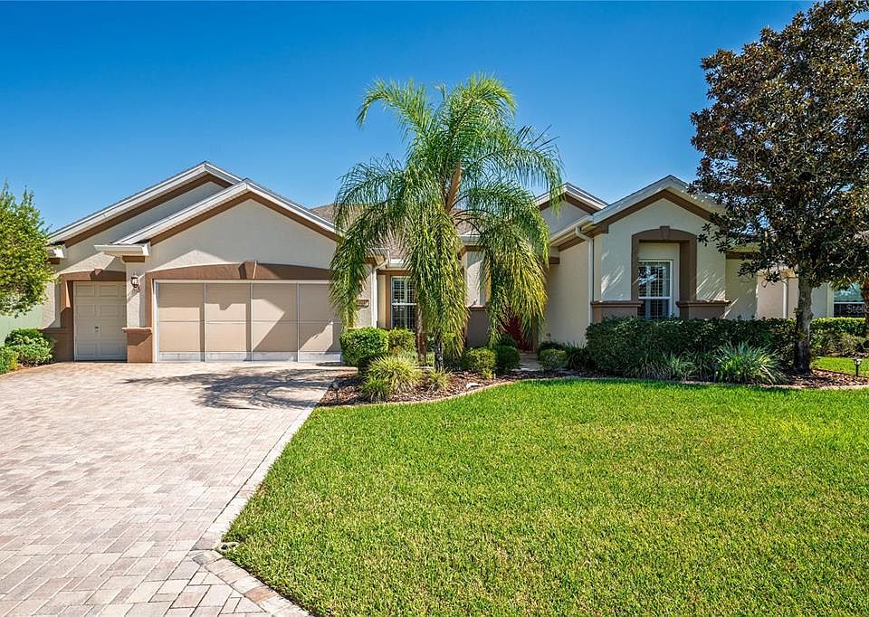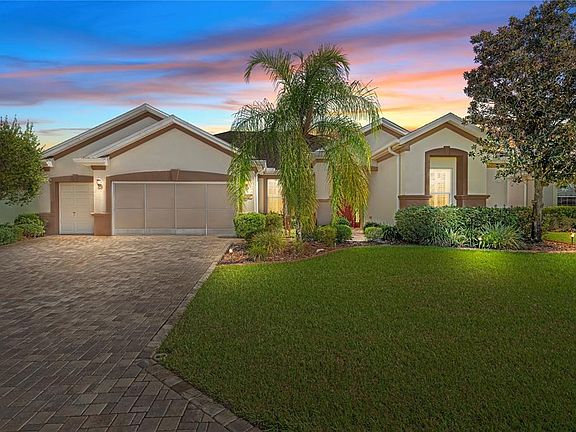 STUNNING GOLF COURSE VIEW! ONE OWNER! Experience the best 55 plus has to offer! This is a Del Webb Community! A lot of curb appeal with this home, pavers to the front door, mature landscaping and it wouldn't be Florida without a tall palm tree! This home is Priced UNDER the average cost, with over 2,400 Sq. Ft. 3 bedrooms, 2 bath situated on the premium panoramic golf view! Low HOA and lower taxes, ROOF 2022, HVAC 2018. Open floorplan with the great room bridged to the formal dining room and family room linked with the kitchen and cafe area. Kitchen is equipped with stainless steel appliances, stone counter tops, under cabinet lighting, pull out drawers and impressive backsplash blending it all together. There is also eating space for 4 at the kitchen bar. This home is great for entertaining and when you have family and friends come to visit. Paddle fans and plantation shutters throughout. Split floorplan provides privacy for all, larger guest rooms with mirrored closet doors. Primary suite has sliders for exclusive access to the extended lanai with birdcage style screening with pretty turtle shell concrete flooring. The master bath has custom walk-in closet and newly designed walk in shower, so much room! Enjoy year round sunrises with coffee in hand on the lanai and listening to the water fountain and evening lighting savoring that view! There are paddle fans through out, a 3 space garage, plenty of room for cars, golf cart and storage. The best thing about this home, is there is a view of the golf course from almost every room! Stone Creek community boast an 18-hole champion golf course, on property restaurant, indoor and out heated pools, fitness center, pickleball, bocce ball, tennis, basketball, softball field, horseshoes, indoor and outdoor spa with services, shuffleboard, state of the art billiards room, two clubhouses and numerous lakes and ponds that you can fish from. Many activities and groups and clubs to participate in. Not only is this a golf cart community, you can also golf cart to three different area plazas for grocery shopping, more restaurants, go to the doctor, dentist, get your nails done, a barber shop and much more all on a golf cart path provided. Shalom park is right down the road, enjoy over 40 acres of botanical beauty and the town square is right around the corner for weekend entertainment. Why wait to build when this home is move in ready! Make sure you catch the video tour! Schedule your visit today and experience the most affordable luxury community in the area.