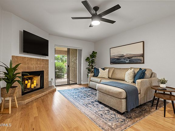 Fabulous ground-level condo in Village Three, a McCormick Ranch Community. Upon entry to this 2 bedroom/2 bath residence, warm hardwood oak flooring welcomes you into the spacious living room, replete with recessed lighting and cozy fireplace, with dining area and one of two great covered patios. The large kitchen features granite counters, wood cabinetry, durable ceramic tile, informal breakfast area and additional patio access. The oak wood flooring continues throughout both bedrooms, and primary bedroom features a large, walk-in closet and bath w/dual sinks. Both bedrooms have large sliding glass doors to the second covered patio and both bathrooms have real wood vanity cabinets. Entire unit has been painted, upgraded with new HVAC, ceiling fans & front-load laundry appliances.