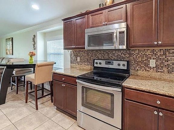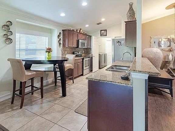 Step inside to a bright, 4BR 2 BA home enhanced by warm wood laminate flooring that sets a calm, inviting tone. The gourmet kitchen impresses with granite countertops and sleek stainless-steel appliances. The spacious primary suite includes a beautifully appointed bathroom with dual sinks, a large walk-in shower, and a relaxing soaking tub. Unwind on the screened-in patio and enjoy peaceful sunset views and experience the perfect blend of luxury and convenience in this stunning home within the gated community of Palm Breezes.