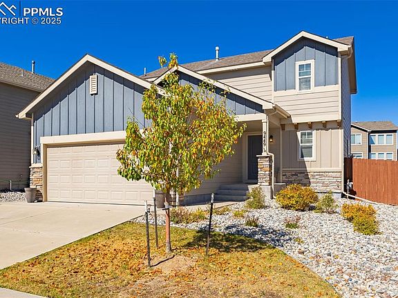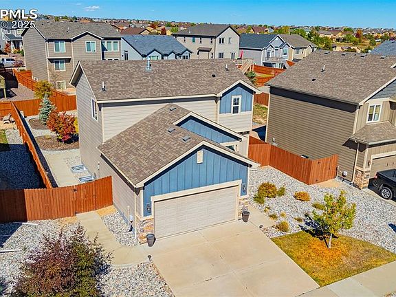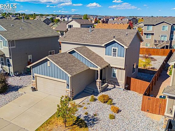 Nestled in the welcoming neighborhood of Meridian Ranch, this property offers a balance of accessibility and tranquility. You're a comfortable drive from Colorado Springs, with proximity to amenities, schools and local conveniences. You're favorably located on a cul-de-sac street with no through-way traffic and distant enough from nearby busy intersections, but close enough to walk to your favorite shops and eatery's. Once you step into this well-maintained 2016 built home you immediately notice the modern comfort and design that blends living, dining, and kitchen space in a seamless flow. Dark wood laminate floors extend the entire main level, a gas fireplace compliments the living room, a convenient half-bathroom is available for guests, a walk-out to your spacious backyard is available through the dining room, and your kitchen is functional and stylish with a large quartz countertop island, stainless steel appliances, and ample cabinet and pantry space. Upstairs you'll find your primary suite, complete with a 5-piece en-suite bathroom and generous closet space. Two additional bedrooms, one with a walk-in closet, and a full bathroom round out the upper level. The basement is unfinished, but ideal as a recreation room, a fourth bedroom and plumbed for another full or 3/4 bathroom. Your backyard is fenced for privacy, and offers landscaping that is *chefs kiss* perfect for outdoor entertaining and gatherings! Additional features within Meridian Ranch include access to recreation centers, golf courses, walking trails, and parks. Proximity to both Woodmen Road and US CO-24 make this location extremely accessible to Peterson SFB, Schriever SFB, Fort Carson and the Colorado Springs Airport. Be sure to see this home today!