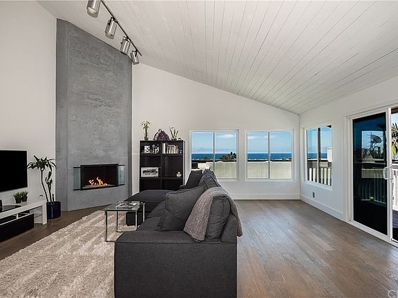 Breathtaking PANORAMIC Ocean Views that you must see to believe! This meticulously upgraded end unit with its open floor plan is fully remodeled with top of the line stylish contemporary flair featuring: large picture windows; hand crafted wide plank wood flooring with high end hand crafted stainless steel railings; soaring whitewashed 14 foot vaulted ceilings anchored by a custom fireplace surround made of Venetian plaster. The fully remodeled kitchen offers horizontal grained cabinets; stainless appliances; white quartz counters; glass tile backsplash with custom LED under cabinet lighting. Guest bathroom includes marble topped vanity and terrazzo tile floors. A phenomenal 164 square foot sun deck with ocean views provides a great place to relax and unwind. The Master Bedroom and Guest Bedroom, both en suite, offer upgraded carpet, and remodeled bathrooms. The Master Bedroom includes recessed LED lighting, electric wall fireplace and built in stereo wiring. Master Bathroom features glass dual vanity, new tiling, new fixtures with rain shower and split quartz accent wall. This rear unit is off the street creating a quiet and private retreat. Also includes: full laundry room, Ring Doorbell and security camera system, large direct access 2-car garage with epoxy floors, new stainless door hardware, fresh paint and new electrical outlets and switches throughout! So much to offer with custom high end upgrades + walking distance to the beach, shops, restaurants and entertainment!