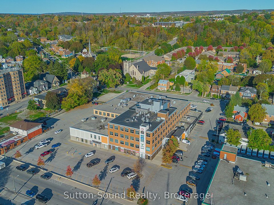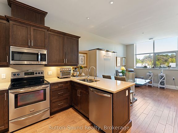 Luxury Downtown Living in Owen SoundIf youre looking for elegant, maintenance-free living in the heart of downtown Owen Sound, this stunning condominium is not to be missed. Offering exceptional quality with very reasonable condo fees, this unit showcases sophisticated design and thoughtful details throughout.Step inside to discover nine-foot ceilings, rich hardwood flooring, refined trim work, and a custom kitchen featuring quartz countertops and stainless steel appliances. The spacious suite includes in-suite laundry, wide 36-inch door openings, premium finishes, and a beautifully appointed bathroom with ceramic tile flooring.Enjoy an impressive list of amenities including designated parking, a large storage locker, a stylish party room with pool table and big-screen TV, a modern fitness centre, and an expansive rooftop terrace complete with three natural gas BBQs and multiple gathering spaces perfect for entertaining or unwinding with a view.Additional features include a high-efficiency natural gas furnace, air conditioning, a Heat Recovery Ventilator (HRV), and a rental natural gas hot water tank. Water and sewer are included in the condo fees for added convenience.Experience the best of urban living in this well-appointed, move-in-ready suite. Book your private showing with your REALTOR today!