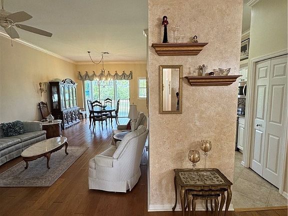 Luxurious coach home with gorgeous settings in Glen Eagle Golf and Country Club, featuring a full deeded golf membership, cable, internet, water, sewer, common grounds landscaping, outside building maintenance, and other amenities currently included in the Glen Eagle master association's semiannual dues. Enjoy plantation shutters, crown molding, updated AC & water heater, Lanai storm shutters, hand scraped wood floors, & garage with overhead storage. American Home Shield warranty policy provided for a period of time, inquire about details. Total under air sq/ft of 2088 with total area 2525 sq/ft. This home has cathedral ceilings, 3 bedrooms, magnificent sunsets, screened lanai, and a spectacular master suite with stunning bathroom. Feel like you are in a one-of-a-kind resort. Updated guest bath & kitchen, no detail has been missed. This bundled Glen Eagle community has an 18-hole golf course, tennis courts, pickleball, bocci, clubhouse with restaurant, fitness center, active social calendar, and pools. The neighborhood, Glenmoor Greens II, has additional amenities included in their association. Move right in and begin your journey, as most of the furniture and wall hangings, within the unit, are included. This turnkey property is designed for luxury, unique, with close proximity to beautiful beaches & downtown Naples. Must see opportunity, a rare gem.