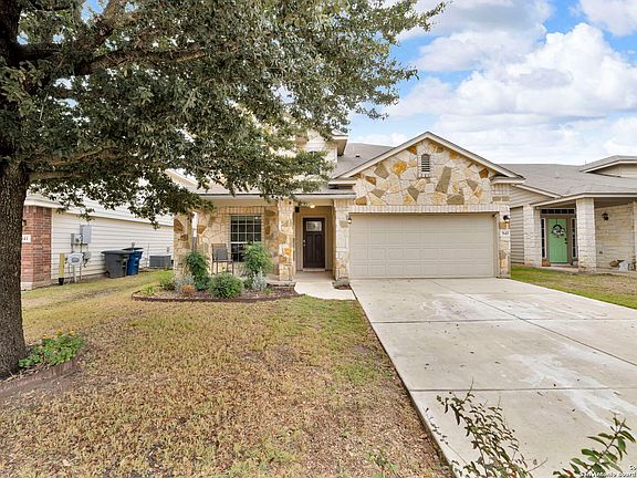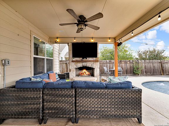 Welcome to 945 Lauren, a beautifully designed 4-bed, 2.5-bath home offering the perfect blend of comfort, style, and privacy in the heart of New Braunfels. The primary suite is conveniently located downstairs, providing a peaceful retreat, while three spacious secondary bedrooms sit upstairs along with their own full bath and second living space. Ideal for everyone to have their own space. A dedicated office at the front of the home creates the perfect work-from-home setup or quiet study space. The open-concept living area flows seamlessly into the kitchen and dining, making this home perfect for everyday living and entertaining. Step outside to your own backyard oasis featuring a covered back porch with a cozy fireplace and a sparkling pool - the ultimate setup for Texas summers. Backing to a greenbelt, you'll enjoy added privacy with no rear neighbors and peaceful views year-round.