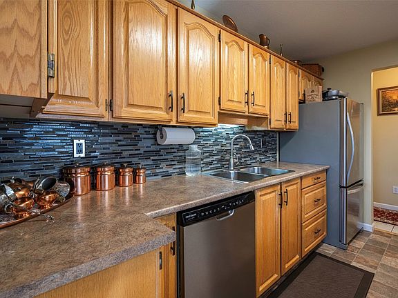 Beautifully maintained top floor corner 2-bedroom, 2-bathroom S.W. facing home! Very spacious, extra large rooms ,tons of storage space including a large walk-in laundry room . Since 2015 a number of updates including Kitchen: S/S appliances, sinks, taps, countertops, backsplash. Bathrooms: toilets and main bath counters. New lighting, cabinet hardware, reflective sun screen on windows. Livingroom has a cozy gas fireplace, separate dining area and an enclosed 100 sf. sun room with lovely mountain views. This home comes with a secure parking stall and storage locker , social room with kitchen, exercise room plus a games room with a pool table. One of Kelowna's' most desirable 55+