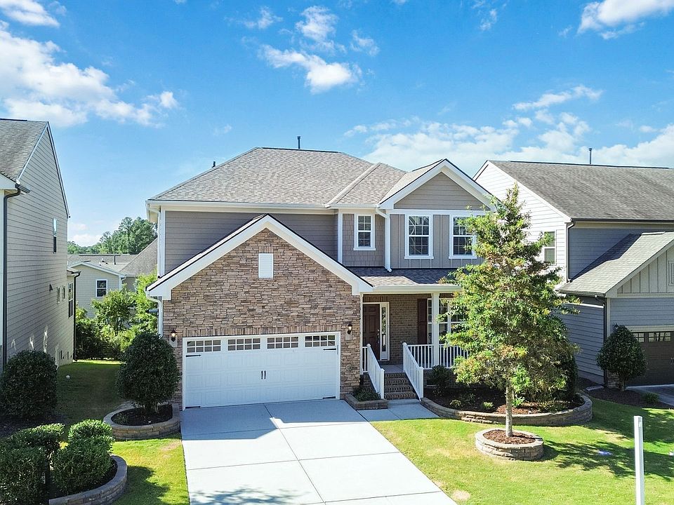 A Rare Opportunity in Cary - Outstanding schools, great location, ready to move in. Move right into this stunning north facing 4-bedroom, 3-bath home with an open floor plan in a highly sought-after Cary neighborhood. Enjoy the best schools in Wake County and the convenience of nearby shopping, trails, and major highways. Just 3 minutes to 540 and 15 minutes to RDU Airport. The stone and brick-accented front of the home iscomplemented by exquisite landscaping, stone edging with color lights and a charming front porch. The first floor features a bedroom and full bath, perfect forguests or in-laws. The open and light-filled family room seamlessly connects with the well-appointed kitchen and dining area. The kitchen boasts granite countertops, an island with a breakfast bar, stainless steel appliances, and a walk-in pantry - a chef's dream. Relax in the sunroom with beautiful views of the trees and the large deck, perfect for your morning coffee. A dedicated workspace with built-in desks and cabinets completes the first floor. Upstairs, the large master bedroom includes an ensuite sitting area, a spacious walk-in closet, an exquisite walk-in shower, and dual vanities - a true owner's retreat. Two additional bedrooms and a bath provide ample space for family and guests. A large loft area offers space for TV, gaming, play, or relaxation. The spacious laundry room is equipped with cabinets. The 2-car garage comfortably holds two cars and features an epoxy floor coating. The home is equipped with a pre-installed Ring security system, a tankless water heater and a new roof installed in 2025. Outside, the generous backyard features several plants and mature trees for privacy, with enough space to grow your own vegetables and flower beds. The front yard is beautifully landscaped with stone edging and color lights.The home is ready for you with a fresh coat of paint and is in immaculate condition.