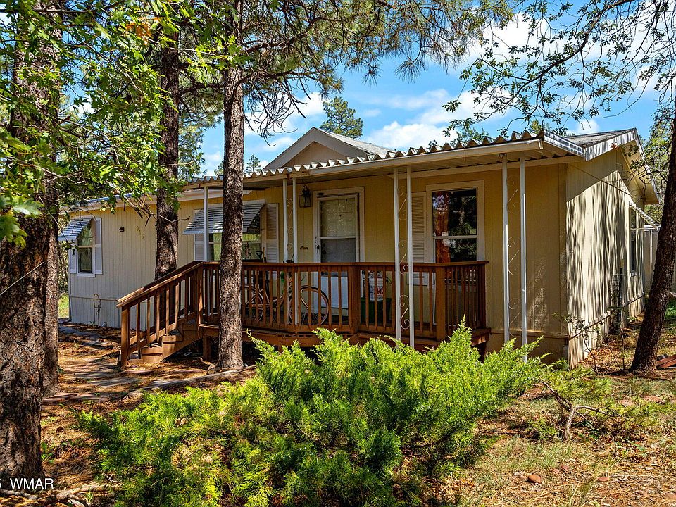 Welcome to your private retreat in Show Low Heights! This 3-bed, 2-bath home offers 1,232 sq ft of comfortable living on a nicely treed lot with no HOA. Inside you'll find a split floor plan with fresh paint, updated flooring, and plenty of natural light. The kitchen includes a breakfast bar and dining nook, while the spacious primary suite features dual sinks, soaking tub, and walk-in closet. Relax on the covered front porch or entertain on the large back deck overlooking private land. The partially fenced yard is perfect for pets, and two sheds provide extra storage or workshop space. Conveniently located near schools, shopping, and outdoor recreation, this move-in ready home combines privacy, comfort, and value in the heart of the White Mountains.
