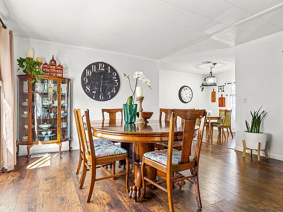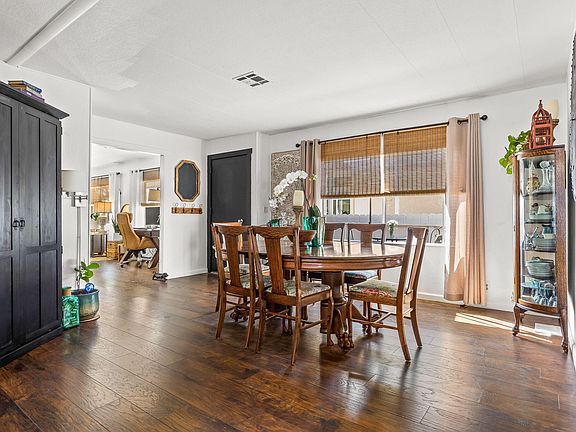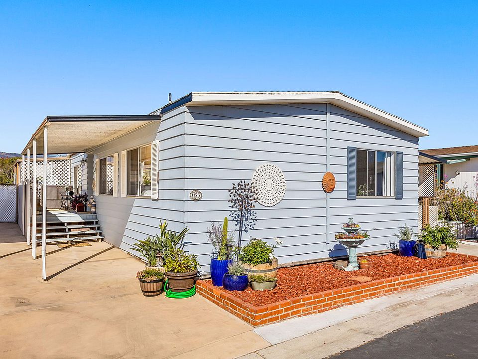 This gem will not last long! Renovated 1975 manufactured home showcases two bedrooms, two baths, a front porch, and a spacious living room with an adjoining formal dining room. The home has an eat-in kitchen with a farm sink, open shelving, ample storage, a wet bar with a wine refrigerator, and a reverse osmosis water system. The secondary bedroom is at the front of the home with a bathroom and a separate laundry room off the kitchen. The primary suite features a private bath and walk-in closet. Sliding doors open to a secluded oasis that leads to a lovely fully fenced yard starring a tranquil covered stone patio, rose bushes & a lemon tree with two storage sheds, and a covered carport perfect for 3-car tandem parking! Situated in resident-owned Rancho Goleta, an all-ages park, amenities include a private lake, year-round heated pool & spa, clubhouse, library, gym & sauna. Easy access to the bike path.