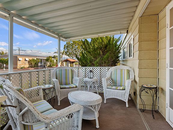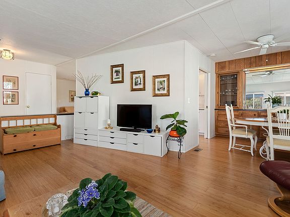 Rancho Goleta, a resident owned community with clubhouse, library, pool & spa and private lake, just minutes to Goleta Beach! This home sits on a large corner lot with fantastic mountain views! Covered front deck leads to large living room with mountain views. Dining area with built-in buffet & china cabinet. Stunning kitchen remodel with quartz counters and built-in appliances, opens to center family room with sliding door to rear yard. Master has two closets and newly updated bath. Bedroom 2 has access to its own bath. Separate laundry room. Bamboo flooring throughout. Dual pane windows & sliders. 2 sheds. Large rear yard with producing avocado, orange & lemon trees. Bike to the beach in 8 minutes! Exceptionally well priced for Rancho Goleta!