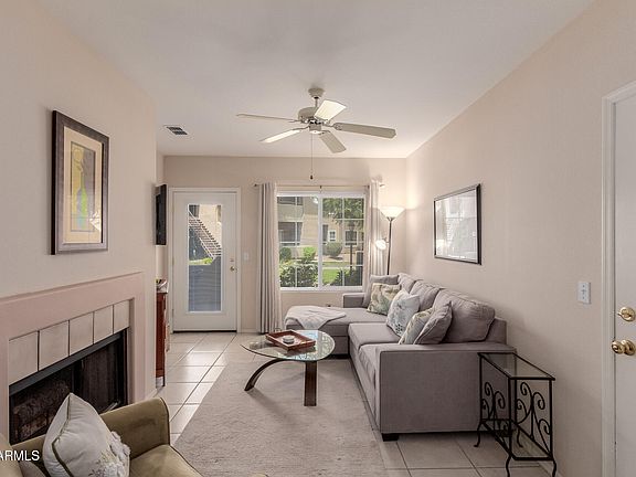 OWNER MAY CARRY on this FULLY FURNISHED spacious Scottsdale one-bedroom, one-bathroom main floor condo featuring a cozy fireplace in the living room, a large private patio, and abundant natural light. The wonderful kitchen is appointed with granite countertops and ample cupboard space. The generous master bedroom easily accommodates a king-sized bed with room for additional furniture and has a walk-in closet and a slider to the patio. The full bath, in-unit washer and dryer, and plenty of extra storage add to the convenience. Step outside to the patio and enjoy the peaceful green space offering both beauty and privacy. This home includes one assigned covered parking space and access to resort-style amenities, including a sparkling pool, relaxing spa, barbecue area, and tennis courts