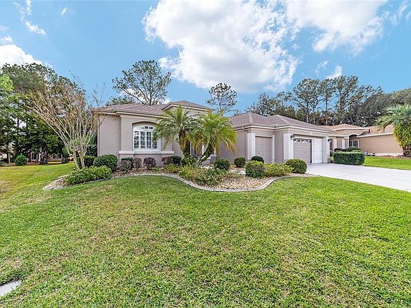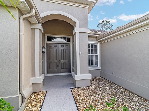 Del Webb Hampton Model features a desirable three-bedroom split-floor plan, two full bathrooms, and a half bath. The home offers recent upgrades, including a new roof (2018) and hot water tank dec 2025 & new Well tank 2024 The primary bedroom is enhanced with a tray ceiling and an updated en-suite bathroom boasting a walk-in shower. The expansive kitchen includes a breakfast bar, granite countertops, and an eat-in area. Additional living spaces include a family room, dining area, sitting area, and a large laundry room with cabinetry. Throughout the residence, you will find plantation shutters, crown molding, and no carpeting. An enclosed lanai with acrylic windows provides excellent views of the greenbelt. The extended garage features a separate golf cart bay, and private well for irrigation. Located within Spruce Creek Golf and Country Club, a 55+ community offering access to 70 clubs.