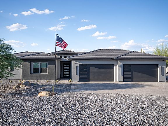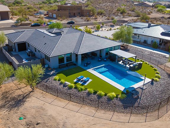 Welcome to your Desert Dream w/ 2x6 Exterior construction, 5.5 inch full spray foam insulation roof deck, exterior, and garage.. NO HOA. Tranquil home set on a 1.098-acre lot. Bring your toys for the 1,245 sq. ft. garage w EV charger, 220 outlet & home has 400 amp service panel & 200 amp sub in garage. Inside you'll find water vapor fire feature, 10 ft ceilings, 4 en suite bedrooms, den and office, a chef's kitchen w/Dolemite waterfall edge counters, double fridge, butler pantry. Indoor-outdoor living w/ a 15 ft full pocket slider, insulated interior walls. Backyard features a heated & chilled pool w/ therapy jets, an outdoor kitchen, & a custom louvered pergola . All just minutes from Lake Pleasant. Home is walking distance to the Sunrise Mountain trails. 250 Gallon propane tank.