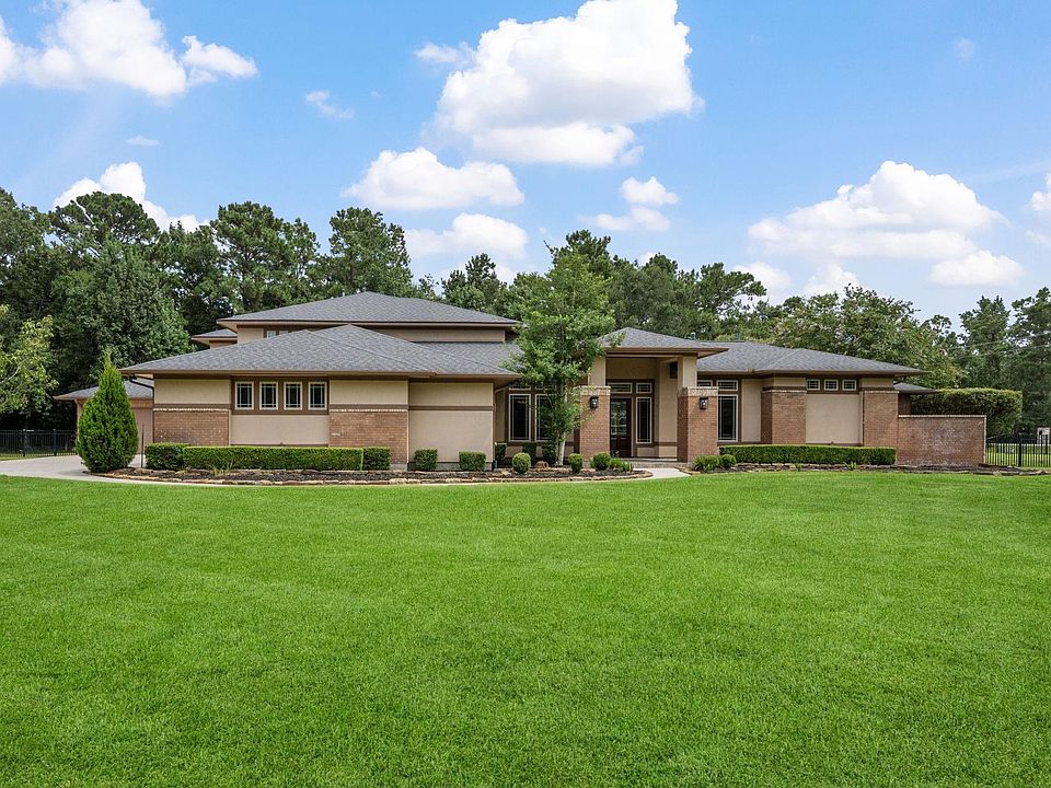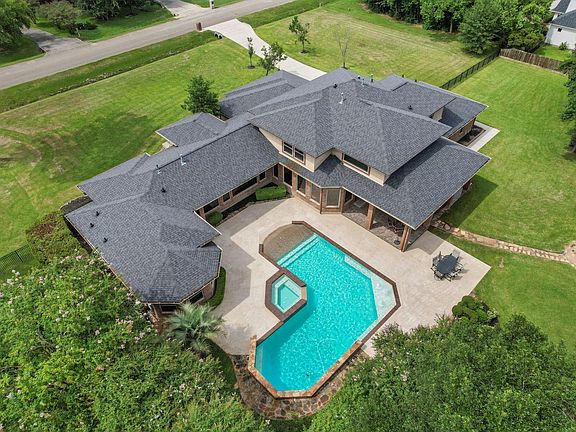 Welcome home to Lake Windcrest! Thoughtfully designed with a focus on functional living, this 5,055 sq/ft home emphasizes clean architectural lines, serene spaces, and sits on a coveted 2-acre corner lot. This exceptional residence is designed for both comfort and distinction. The main level offers a spacious primary suite tucked away on one side of the home for privacy, just past the grand home office, while a guest suite rests on the opposite side, making it ideal for multigenerational living or hosting guests. Upstairs you'll find 2 spacious bedrooms, each with it's own en suite, and built in desks; a massive media room for entertaining, and a large air-conditioned storage closet. In addition, there is also an extra flex room on each level. Outside, enjoy the large heated saltwater pool and ample patio coverage —perfect for year-round relaxation and entertaining. The expansive 5-car garage provides ample space for collectors, guests, or growing families.