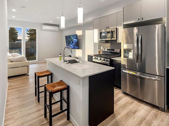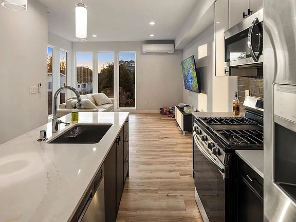 The main level features an open-concept kitchen and living area with high-quality stainless steel appliances, a gas range, a kitchen island, and a pantry. Large windows fill the space with natural light, and the convenience of an in-unit washer/dryer is located on this floor.