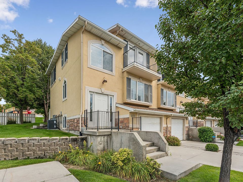 This stunning end-unit townhome, built in 2002 as the builder's original model, is packed with upgrades and modern updates. Featuring new flooring throughout and a rare triple-sided fireplace that warms the living and kitchen areas, this home is designed for comfort and entertaining. Enjoy the convenience of being the closest unit to the pool, clubhouse, playground, mailbox and extra guest parking. The tandem two-car garage offers abundant storage or space for hobbies. Walking trails weave through the neighborhood, and the Jordan River Trail stretches for miles just steps away. Located within walking distance to River Oaks Golf Course and only minutes from I-15, America First Field, Topgolf, shopping, dining, and entertainment, this property offers the perfect blend of lifestyle and accessibility. With its upgraded finishes, end-unit privacy, and unbeatable location, this Sandy townhome is a rare find you won't want to miss!