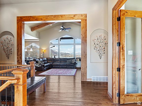 Perched in the prestigious Chalets, this 4,774 sq. ft. luxury retreat offers breathtaking lake and mountain views, seamlessly blending elegance, comfort, and modern convenience. Thoughtfully designed and sold fully furnished, this 4-bedroom, 4.5-bathroom masterpiece is both an entertainer's dream and a peaceful mountain escape. Step into the inviting foyer, where rich wood floors and rustic timber accents set the tone for the home's warm and sophisticated design. To the side, a versatile space serves as an office or additional bedroom, offering flexibility to fit your lifestyle. Continue into the expansive open-concept living area, where vaulted ceilings and oversized windows showcase breathtaking panoramic views. A floor-to-ceiling stone fireplace, complemented by custom built-ins, creates a stunning focal point, adding both charm and functionality. The chef's kitchen is as stylish as it is functional, featuring a gas range, double ovens, stainless steel appliances, and generous counter space, making it ideal for both cooking and entertaining. Through double doors, retreat to the luxurious primary suite, where picturesque views set the stage for relaxation. The spa-like en-suite bathroom features a soaking tub, walk-in shower, and dual vanities, while a spacious walk-in closet provides ample storage. Designed for ultimate entertaining, the lower level is a haven of luxury, featuring brand-new radiant heat, a kitchenette, a state-of-the-art home theater, and a full sauna. This space seamlessly transitions to the expansive outdoor living area, where a hot tub, custom outdoor kitchen with a brand-new American Grill, natural gas hookup, and striking rockwork create the perfect setting for gatherings. A gas fire pit and tranquil water feature enhance the ambiance, while a beautifully crafted stone staircase provides easy access from the back deck to the driveway, adding both elegance and convenience. With a central vacuum system, whole-home soft water system, brand-new furnace and AC, and unrivaled panoramic views, this home is designed for luxury and ease. Just minutes from Snowbasin, Powder Mountain, and Pineview Reservoir, this extraordinary retreat offers the perfect balance of adventure and tranquility. A rare opportunity to own a true mountain sanctuary-this is mountain living at its finest. All property information, boundaries and documents to be verified by buyer.