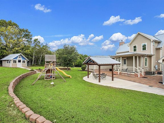 Tucked beside the picturesque creek & the community’s well-known covered bridge, this 2010 custom farmhouse captures the essence of country living with today’s conveniences. Set on 3.577 acres, the property offers space & privacy. The home spans 2,605 square feet, 3 bedrooms, 2.5 baths and office. Inviting wraparound porch, standing-seam metal roof, brick-skirted pier & beam foundation with bell piers, & gazebo.