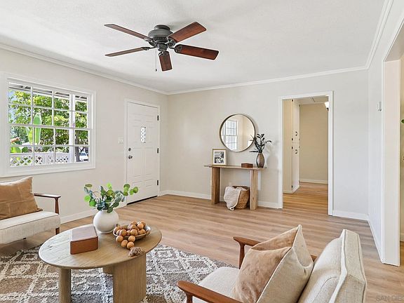 Welcome to this charming and move-in ready 3 bedroom, 2 bathroom, single-level home featuring stylish new flooring throughout and fresh interior paint that brings a modern, clean feel to every room. The spacious layout includes a large sunroom—perfect for a home office, personal gym, playroom, or a bright space to entertain while enjoying views of the private backyard. Money saving assumable solar. Attached 2 car garage with additional driveway parking. Located just minutes from the 52 and 125 freeways and close to Mission Trails Regional Park, Santee Lakes, El Cajon Mountain, West Santee Schools, shopping, dining, and more.