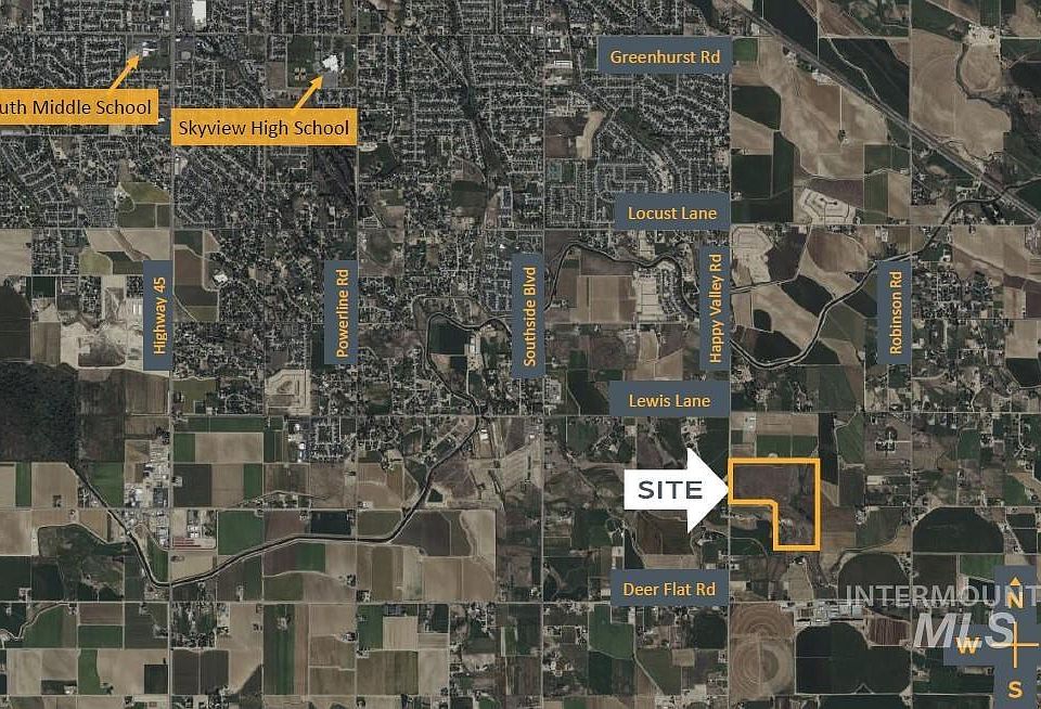 118.406+- acres available. The northern 77+- acres of the property is within Nampa's area of impact and has a future land use of residential mixed use. The entire property is currently located in Canyon County and is zoned agriculture. 1,590 sf home on the property. Property is not currently being farmed. No city sewer / water to property.