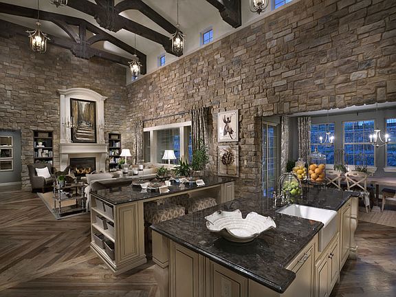 Plan Two: Main Floor Master, 3,564 finished square feet, 3 bedrooms + study + loft, 3 ½ to 4 baths, 3 to 4 car garage. This plan combines the ease of a main-level master bedroom with the space of a two-story. It also presents you with a difficult decision: would you rather give yourself a fourth garage space, or extend the courtyard to include a sitting area with an optional outdoor fireplace? Fortunately, you don't have to choose right now. Just savor the idea of a wide-open great room and kitchen which feel even more expansive thanks to two-story ceilings that stretch over the entire space. Or imagine unwinding in your master bathroom, with its elegant free-standing bathtub.