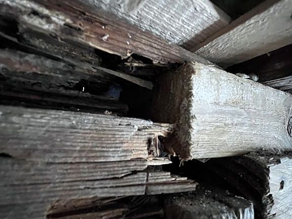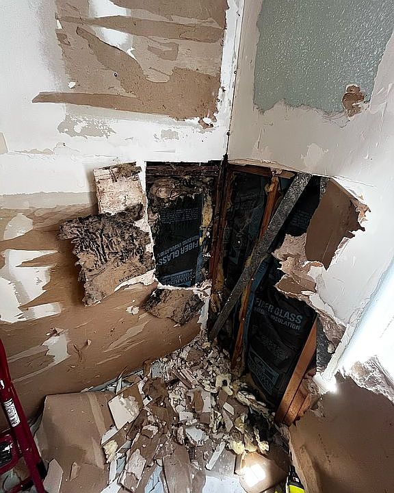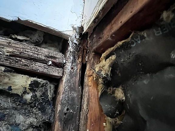 The condominium has sustained significant water damage due to improper installation of the exterior decking, which allowed water intrusion into the building envelope. As a result, there is extensive moisture damage, including mold growth and rotted wood framing within the affected areas.