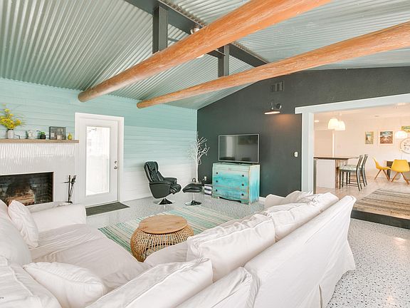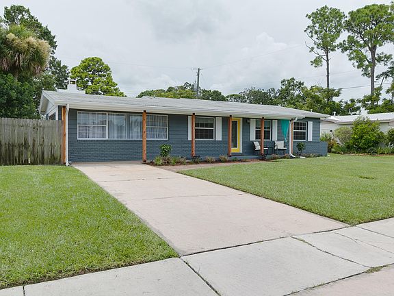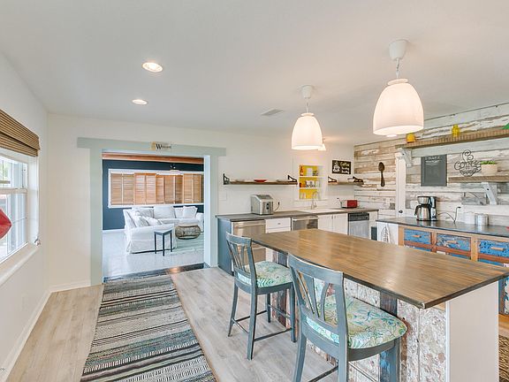 A TRULY CHARMING, one of a kind house ~ 947 Kings Post Road! Located in Georgetown Neighborhood, one of the best school areas of Rockledge. Updated with warm & whimsical design elements & a cheerful color scheme that add not only form but also function. Enter through a decorative glass adorned front door, a distressed wood motif begins on the shiplap style accent wall & continues to the lower cabinetry accented with concrete countertops & a large kitchen island with wood counter, the perfect focal point of this communal space. Kitchen area is highlighted with a cozy dining nook. Spacious family room has a vaulted exposed beam, corrugated metal ceiling along with a wood burning brick hearth fireplace. Access the backyard through a door to the concrete slab patio, perfect for entertaining in your shady, private backyard with a shed & covered work area. Plenty of room to add a pool plus plenty of side yard space for heavy equipment. This sweet, lovely home will go quick ~ don't miss out