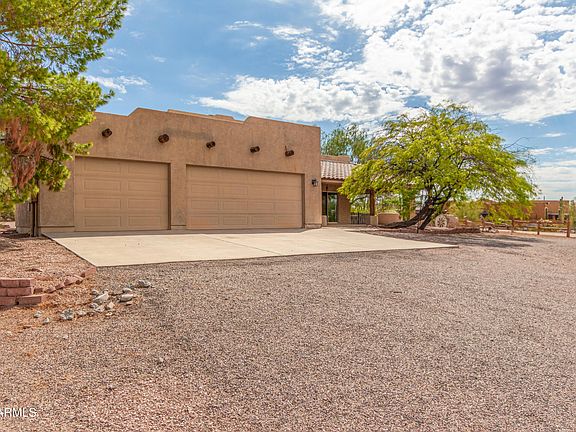 Custom home on 1.183 acre horse property w/ breathtaking mountain views! Single level 3 bed 2 bath split floor plan home w/ a 3 car garage. Open floorplan. Walk into the great room & kitchen w/ dramatic 12' floor to ceiling sliding glass doors overlooking the mountain. Tile throughout, no carpet. Kitchen is open to the family/great room & includes newer stainless steel appliances, corian counters, 10-12' ceilings & bar stool seating. Primary bedroom has an exit to the backyard w/ a patio & walk-in closet. Backyard overlooks the superstition mountains & includes a paver patio, built in BBQ.