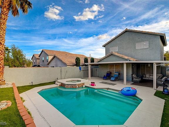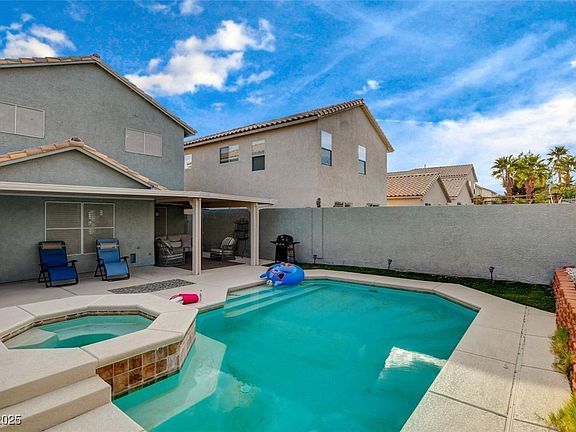 Welcome to beautiful Southwest Las Vegas.NO HOA!!!!!! Yahoo. This home features its private pool and spa for the blistering summers. Find shade in the covered back porch after a swim in the sparkling pool. Walk into an open floor plan with kitchen, eating nook and living room. The granite kitchen has an eat at island and a separate eating nook. Pantry and storage closet under the stairs. Head to the carpeted upstairs complete with washer and dryer. The carpeted primary bedroom has an en suite and is separated from the other two carpeted bedrooms. Many ceiling fans throughout the home both upstairs and downstairs.