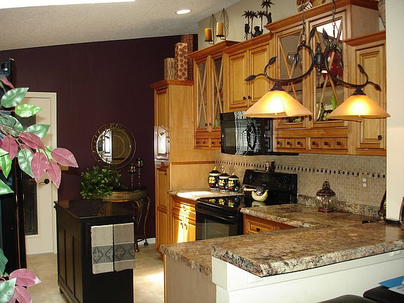 Absolutely beautiful, spotlessly clean, well maintained, freshly painted Palm II w/upgrades galore. (Furniture available for sale separately) Kit. completely remodeled w/new kitchen cabinets, counter-tops, kitchen appliances & beautiful glass door that leads to garage. Both bathrooms updated w/vessel sinks, granite vanity tops, back-splash, newer toilets. The Master Bath includes large walk-in shower w/updated glass doors. Large pretty tile throughout entire home w/French Doors leading to large Family Room. All lighting/fans updated with style. Ceilings are vaulted with knock-down texture (no popcorn). Delightful back patio offers two person hot tub w/privacy overlooking large fenced back yard. Garage w/painted floors, walls & door screens. Includes garage freezer/oversized laundry tub.