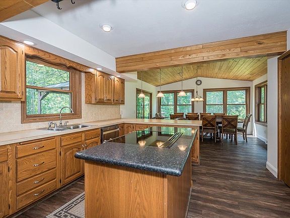 This spacious and well-maintained home offers the perfect blend of country charm and modern updates—just minutes from town with paved roads leading to a blacktopped driveway. Set on a beautifully landscaped lot, the property features two garages (one attached, one detached), 6 bedrooms, 2 bathrooms, and over 3,000 square feet of finished living space. From the moment you arrive, you’ll notice the pride of ownership. The main floor welcomes you with a comfortable living room that flows into an open kitchen and dining room with vaulted ceilings, backyard views, and access to the deck—an ideal layout for everyday living and entertaining. This level also includes three generously sized bedrooms, a full bathroom, and a versatile fourth room that could serve as a bedroom or home office. The lower level offers fantastic additional living space with two egress bedrooms, a large rec room, and excellent storage. The home is connected to city sewer, has a private well, propane heat, and a 16KW Generac generator for peace of mind. Located in the Maple School District. Thoughtful updates include: seamless gutters, spray foam insulation in the lower level, drain tile, sump pump with battery backup, triple-pane (tinted) dining room windows, double-pane windows throughout (Arrowhead Window & Door), vinyl siding on the house and garage (2015), basement egress windows, propane furnace (2023), Samsung kitchen appliances, updated flooring, and more. A gazebo added to the deck enhances outdoor enjoyment. If you're looking for space, functionality, and a peaceful setting with convenient access to town, this property is a must-see!