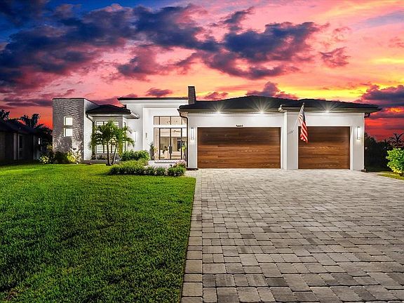 Introducing an extraordinary waterfront residence designed by the renowned Sater Design Group, celebrated for their award-winning designs worldwide. This custom-built soft contemporary home sits on an oversized 0.34-acre lot with stunning intersecting canal views and direct boating access to Charlotte Harbor and the Gulf of Mexico. Offering 2,836 square feet of air-conditioned living space plus 1,648 square feet of unconditioned areas, this home delivers a complete lifestyle experience inside and out. A dramatic glass entryway welcomes you through 10-foot double glass doors with sidelights and a transom window above, setting the tone for the thoughtful architectural details and upscale finishes throughout. The open-concept interior includes three spacious bedrooms, three full bathrooms, and a dedicated office. Soaring ceilings, 8-foot solid core shaker interior doors with Emtek hardware, and PGT impact-resistant casement windows and sliders fill the home with natural light and serene views. The chef’s kitchen features high-end Thermador appliances—including an induction cooktop with vent hood, double ovens, built-in side-by-side fridge and freezer, full-size wine cooler, and under-counter microwave—all integrated into custom double shaker cabinetry with glass display uppers and quartzite countertops. A floating buffet anchors the adjacent dining area, while a large walk-in pantry adds a second Bosch dishwasher, custom cabinetry, and quartz workspaces matching the kitchen and laundry room. The owner’s suite is a private retreat with a spa-inspired bath showcasing a freestanding Jacuzzi tub, glass-enclosed shower under soaring 12-foot ceilings, floating vanities with quartz counters, Kohler sinks, and a Toto Washlet. Built-in drawers feature integrated power and custom organization, and the spacious walk-in closet includes attic access. Outdoors, enjoy a resort-style setting with two large covered lanais—perfect for lounging, dining, or entertaining. One lanai features a fully equipped outdoor kitchen ideal for alfresco meals. A custom-designed pool and spa sit at the heart of the outdoor space, enclosed in a picture-frame cage. The pool features a Caribbean blue pebble finish, elevated interior sections for water sports, a sun shelf, a matching tile spa waterfall, LED lighting, and remote control. Over 1,400 sq ft of tumbled marble pavers in a French pattern surround the pool and outdoor shower area, creating a luxurious and durable entertaining space. The oversized lot is professionally landscaped with decorative rock along the canal edge, lush St. Augustine/FloTam sod, and a full irrigation system fed by canal water. Built for efficiency and durability, the home features 12-foot-high CMU block exterior walls with foam insulation, a flat concrete tile roof, with waterproof membrane, a spray foam-insulated attic with no soffit vents for a sealed system, and an oversized Trane HVAC. A hybrid 50-gallon water heater with heat pump and recirculating system boosts efficiency. Additional features include a three-car garage with epoxy flooring, custom CHI doors, jackshaft openers, and impact-rated service door, plus a charcoal/gray French-pattern paver driveway that enhances curb appeal. This exceptional property offers a rare blend of cutting-edge design, luxury finishes, and direct access to some of Florida’s most desirable waterways. This home must be seen to appreciate.