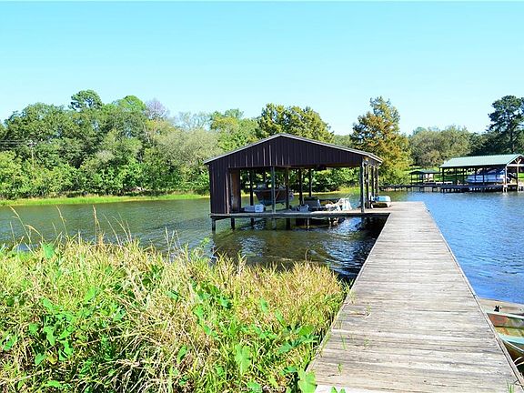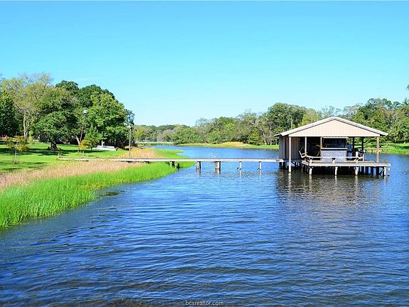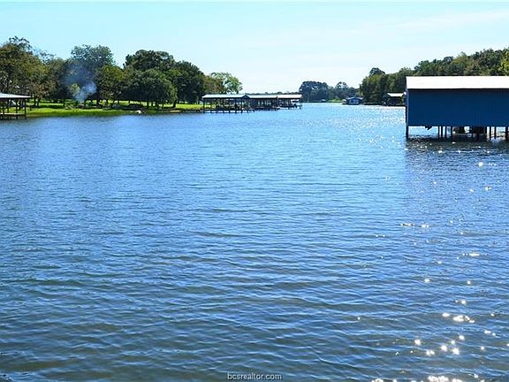 Beautiful elevated lake lot overlooking Flag Branch, with hardwood trees shading the property. 1,512 sq. ft., 3 bed, 2 bath steel A-frame construction with metal roof, Central HV/AC, brick fireplace with blower, Formica countertops, refrigerator, stove, microwave, washer/dryer, large upper deck on the lake side of the home. On the water is a 30' X 39' boathouse with two electric boat lifts, and party deck. Camp Creek Water Co. stock certificate conveys with the property. (Boats negotiable) Franklin ISD.