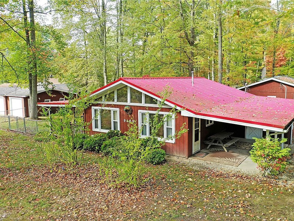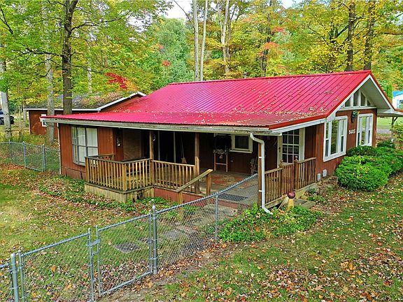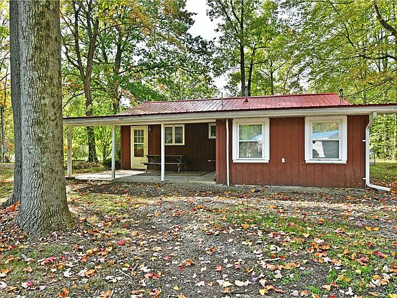 Find your little piece of heaven beneath the trees of this stunningly scenic Linesville, PA home! The immersive corner property sprawls beneath the trees with multiple outbuildings to include a pair of garages, featuring both workshop space in the first and four plus vehicle parking in the other. An additional storage shed, and hidden water treatment systems complete the count. The surprisingly spacious two-bedroom residence features a separate front utility room with commode, a perfect addition for outdoorsmen, pets or general mud room needs. A pair of substantial front and rear patio spaces grace both the fenced in backyard and main entrance; the rear with separate sunroom access. A boldly colored kitchen showcases stained wood cabinets that transcend into the exposed truss, high peaked ceiling. Casual dining overlooks the carpeted living room nearby. The main hall divides the pair of inviting bedrooms with a robust full bath with large vanity.